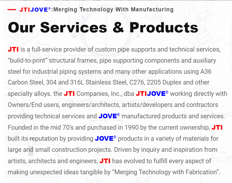 the JTI Companies has been an industry leader for over 40 years in metallic and non-metallic technology and support system designs. JTI Companies is the exclusive manufacturer of the JOVE®️ pipe and duct support system product line.
